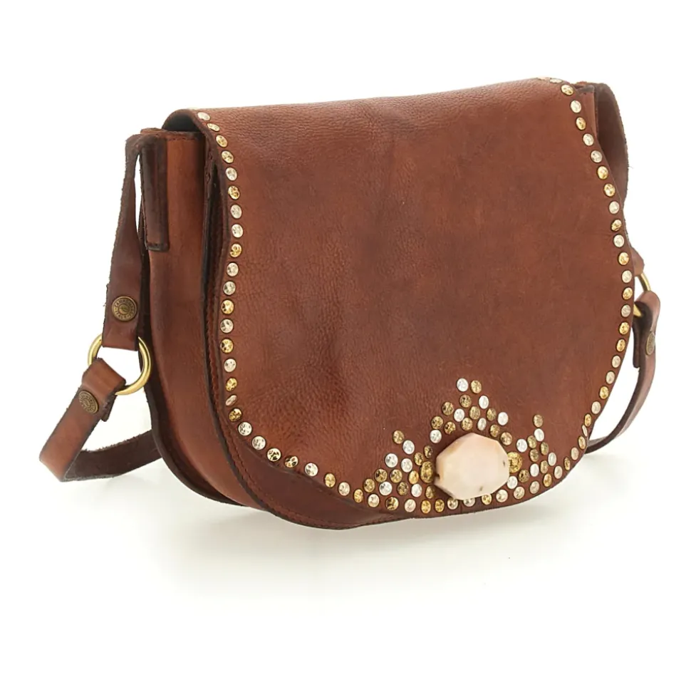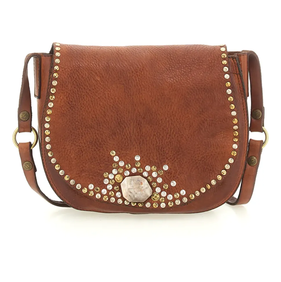 Cognac garment dyed cowhide leather crossbody bag with grey opal stone